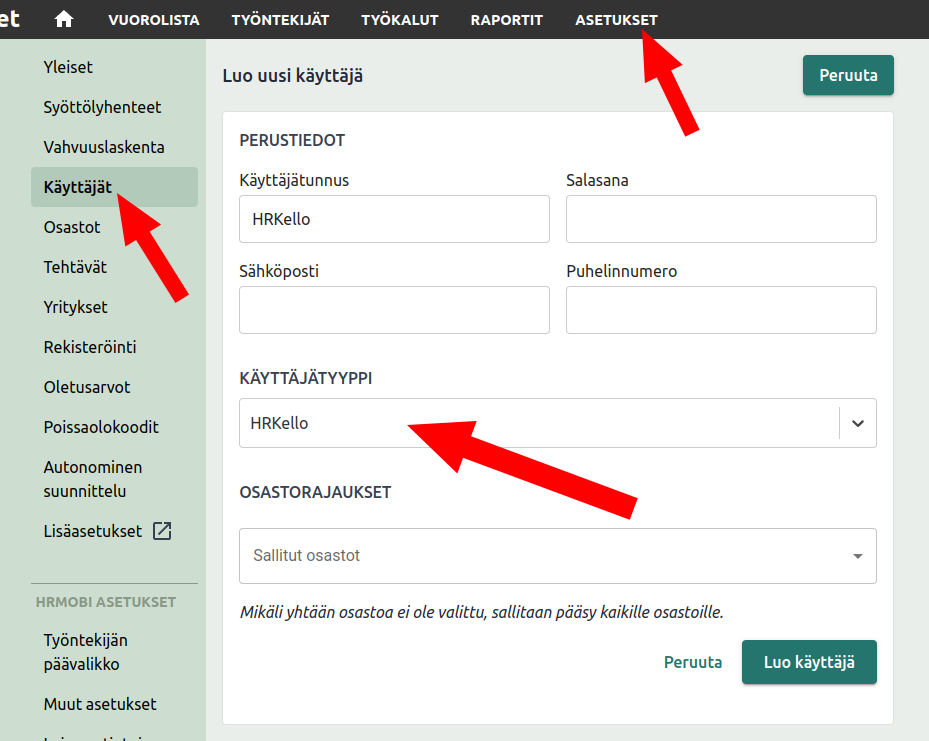 HRKelloa varten on hyvä luoda erillinen käyttäjätunnus, jolla kellokortti aktivoidaan. Käyttäjän pääsee luomaan valitsemalla ylhäältä Asetukset ja sitten vasemmalta Käyttäjät. Tämän jälkeen painetaan Luo uusi.