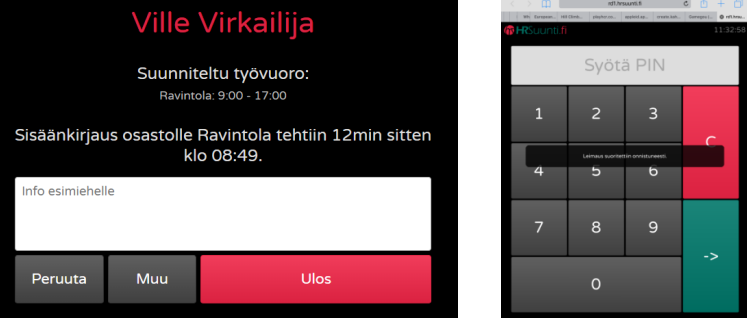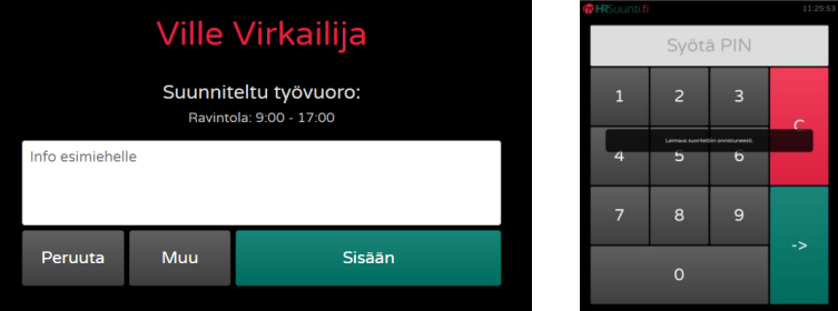 Jos työntekijä tulee töihin 1 tunnin sisällä suunnitellun vuoron alkamisesta, näytetään hänelle PIN-koodin syöttämisen jälkeen näkymää, josta voi painaa "Sisään". Tämän jälkeen seuraava työntekijä voi kirjautua omalla PIN-koodillaan.