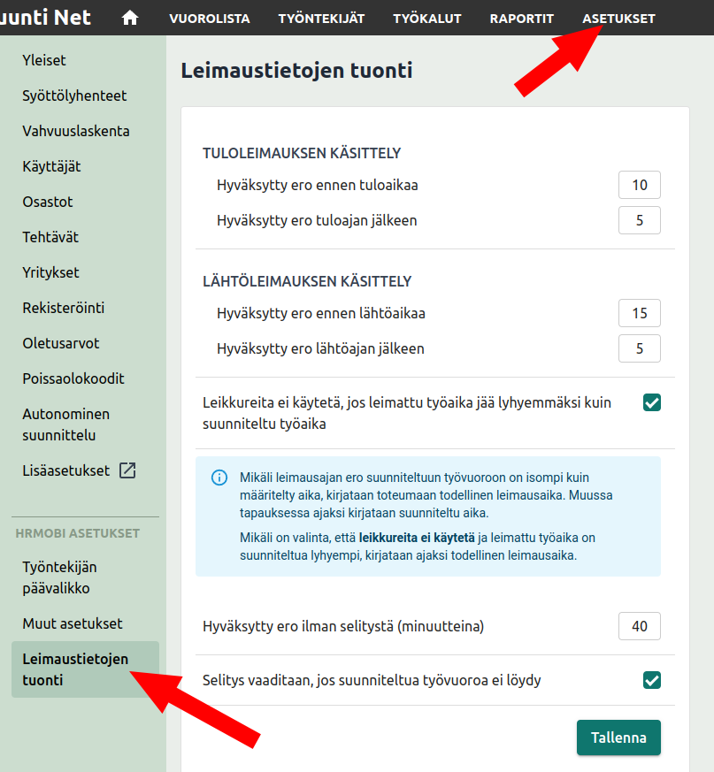 Menemällä Asetukset ja sitten Leimaustietojen tuonti pääsee muokkaamaan HRKellon käyttöön liittyviä asetuksia.