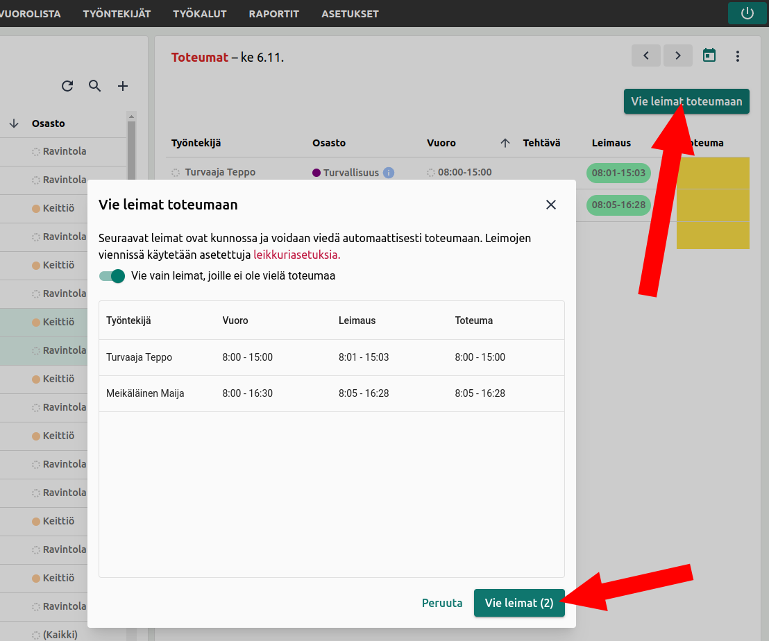 Valitsemalla Osasto-sarakkeesta suodatuksen, on mahdollista viedä vain tietyn osaston leimaukset toteumaan.