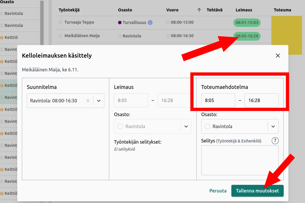 Jos työntekijän toinen leimaus puuttuu, on mahdollista tehdä myös yksittäisen leimauksen tuonti klikkaamalla haluttua leimausta. Aukeavasta ikkunasta voi muokata luotavan toteuman kellonaikoja ja painaa sitten "Tallenna muutokset".